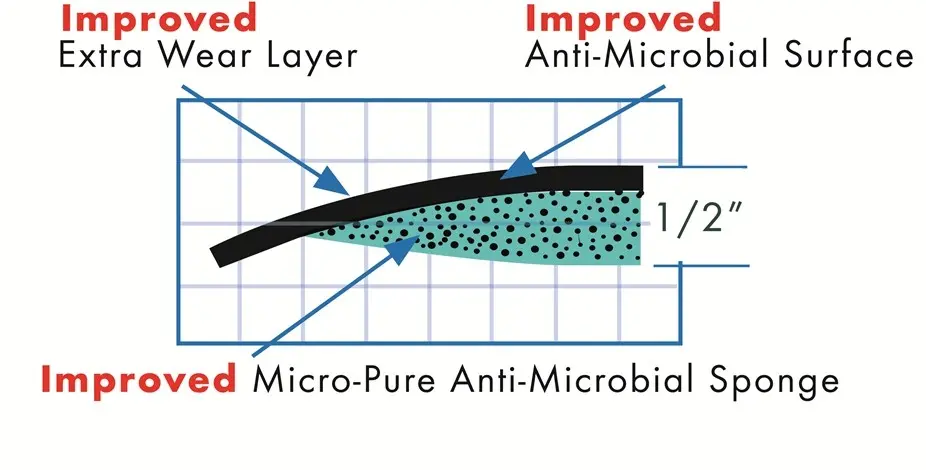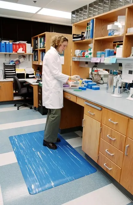 Our premium Tile Top Spongecote anti-fatigue floor mat truly blends comfort, practicality, and beauty like no other. The eye-catching marble-grain design on this floor mat makes it a natural, aesthetic choice for use in commercial facilities that directly service clientele. However, this mat is much more than decoration. Its exclusive Nitricell sponge base brings hours of comfort and stress-relief to workers standing for long periods, and its durable PVC surface is resistance to abrasion from high foot traffic and is easy to clean.