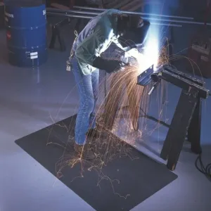 Our Weldsafe Ultrasoft anti-fatigue floor mat far surpasses traditional anti-fatigue mats for use in spot-welding applications. With almost an inch of double thick rubber compound sponge base, the Weldsafe Ultrasoft provides superb cushioning and shock absorption over long periods of welding work. In addition, this proprietary rubber blend has a higher melting point of 285 degrees Fahrenheit, and effectively repels hot metal drippings and sparks. Added safety features include a textured surface for maximum traction and beveled edges to reduce tripping hazard.
